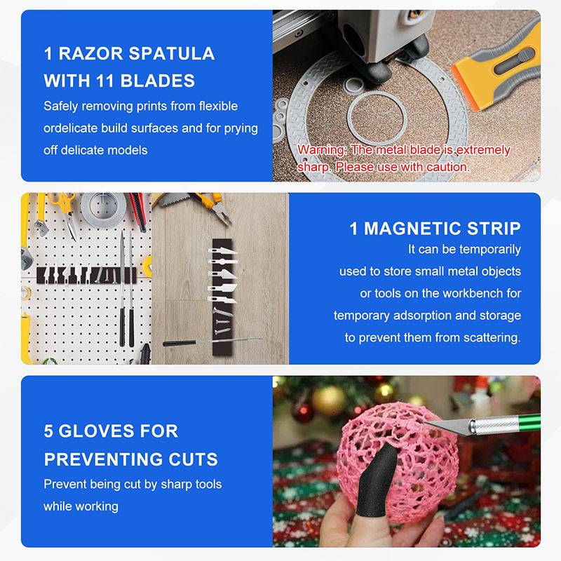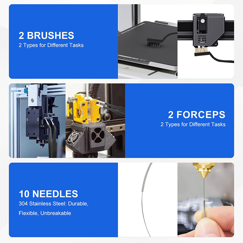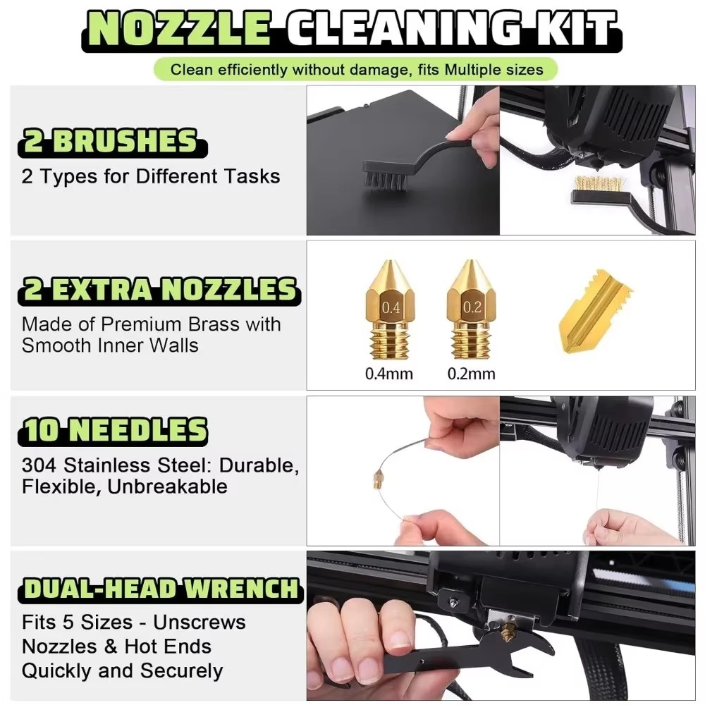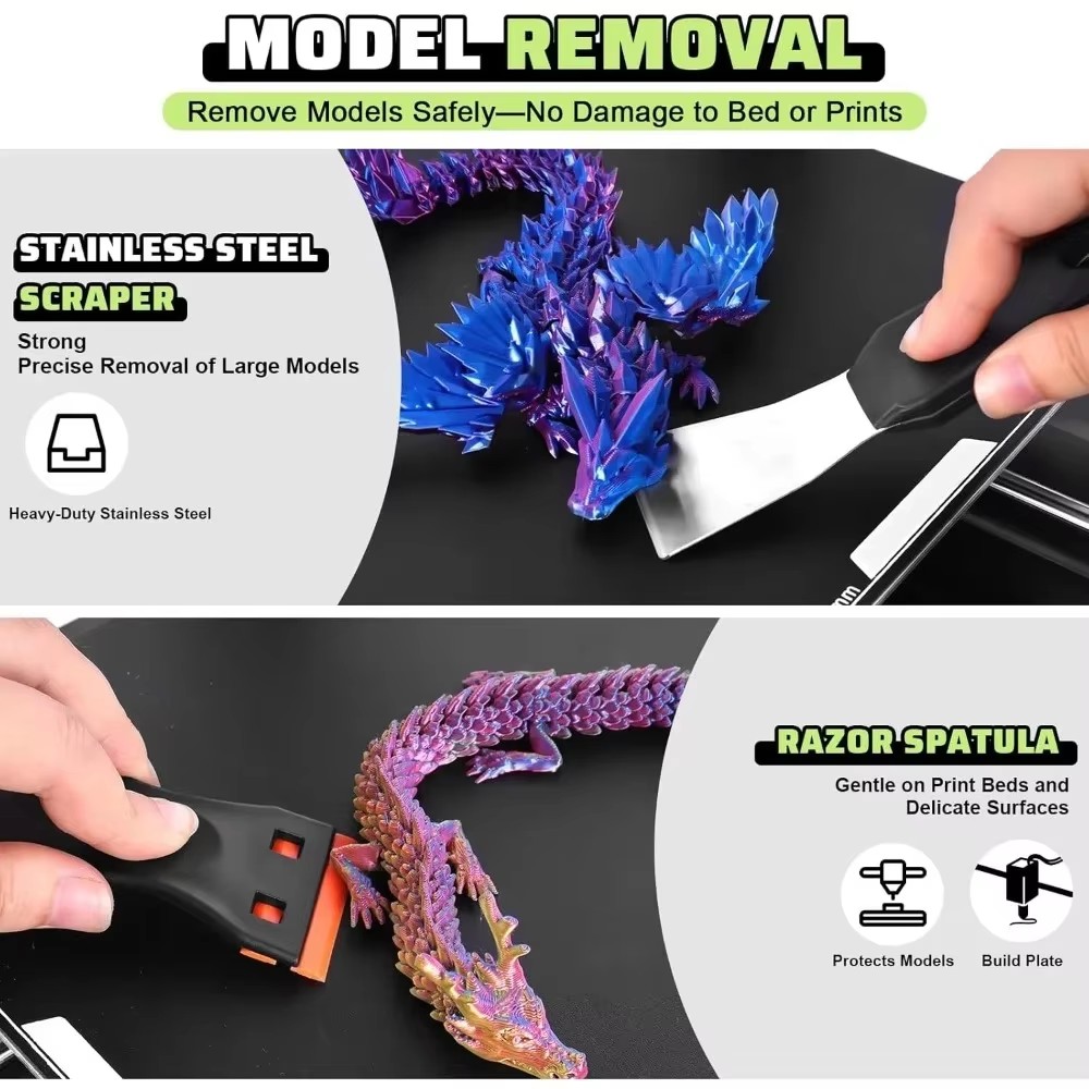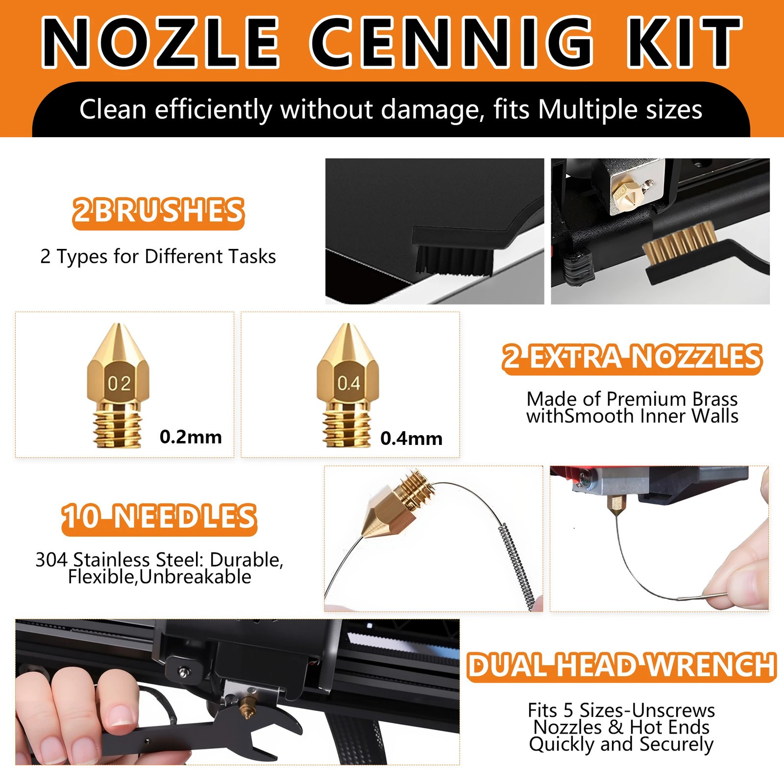 [NOZZLE AND PRINT BED MAINTENANCE]:]Maintain flawless extrusion and effortless print removal with our nozzle care station and dual scrapers. The kit includes cleaning needles, brass nozzles, a heavy-duty steel scraper, and a precision plastic razor scraper, safeguarding your printer bed and ensuring superior print quality.