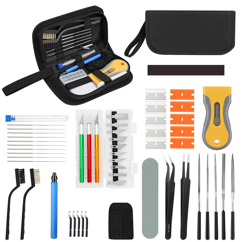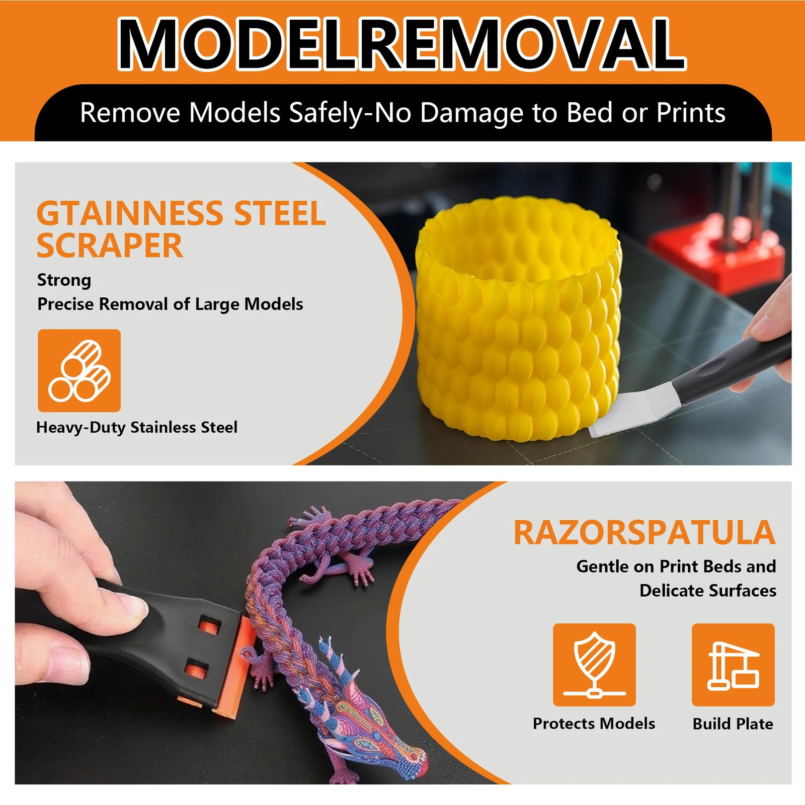 [ADVANCED POST-PROCESSING TOOLS]:Enhance the finish of your 3D prints with our upgraded post-processing tools. The kit includes a modern deburring tool with extra-fine blades and a self-healing cutting mat, alongside a precision knife with SK5 steel blades for detailed work, transforming rough prints into polished masterpieces.
