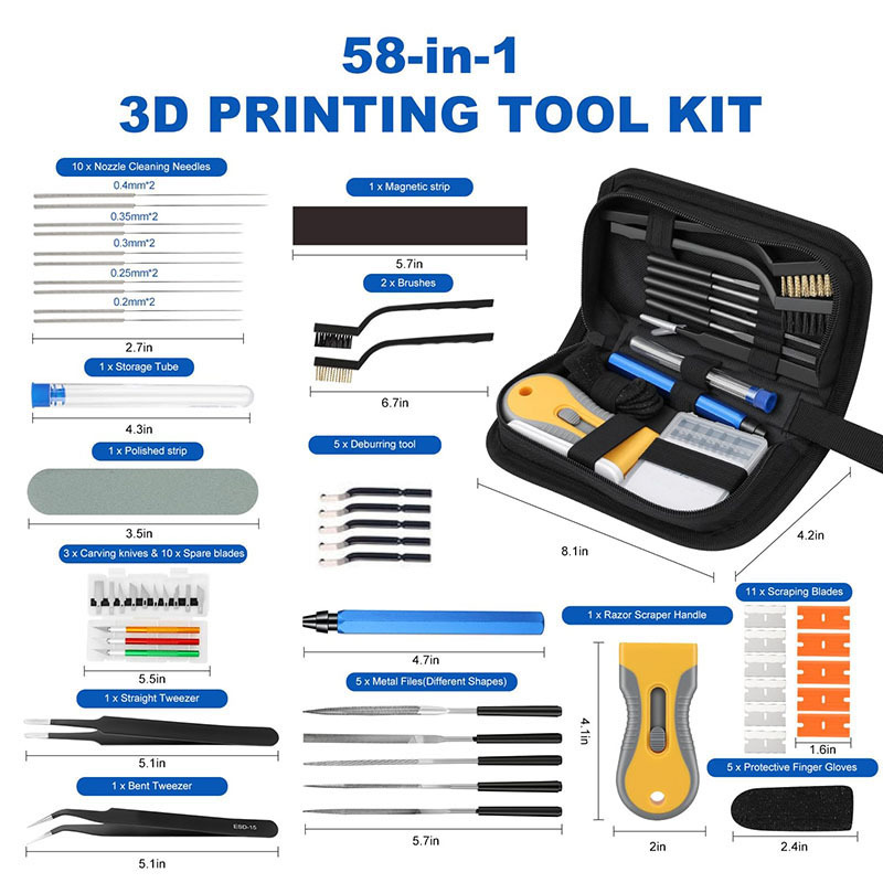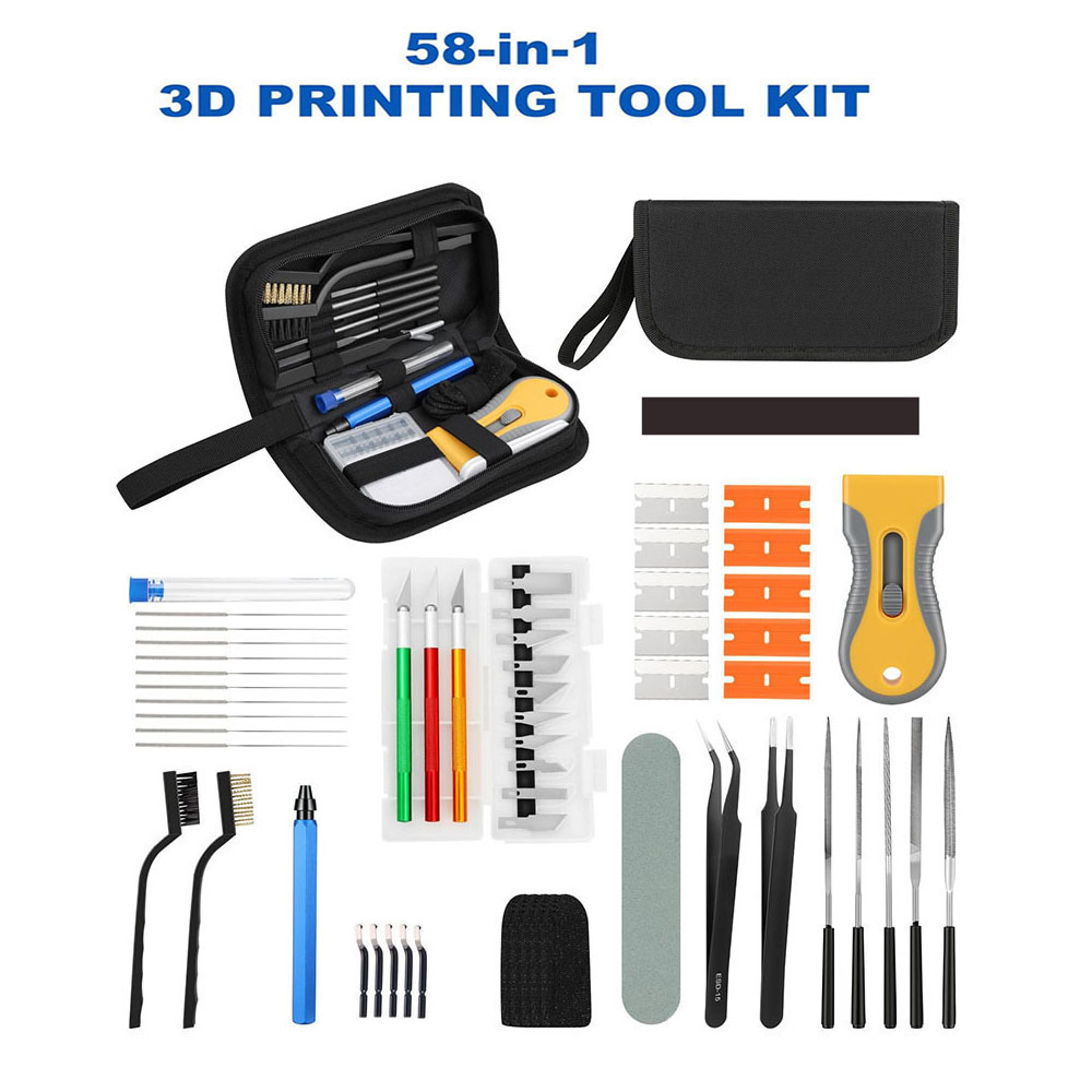 [COMPLETE 3D PRINTING TOOLKIT]:This comprehensive set includes 58 essential tools for 3D printing, featuring additions. Each tool is designed for specific tasks in assembly, maintenance, and post-processing, ensuring you have everything needed for your 3D printing projects. The kit also comes with a durable storage bag for easy organization.