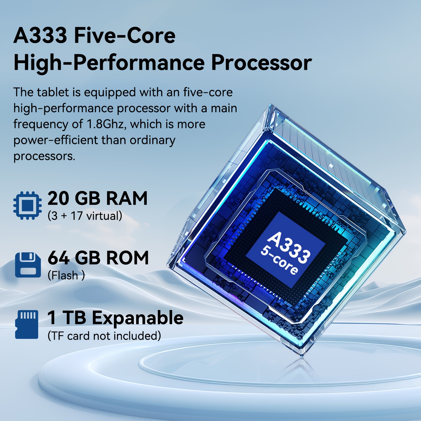 【Android 15&High Performance】Get ready to zip through everything on the latest Android 15 tablet. An advanced 5-core processor and massive 20(3+17)GB RAM (plus smart tech for extra smoothness) deliver desktop-like speed. Game hard, stream your favorite shows in HD, or run multiple demanding apps at once – no frustrating lag, just smooth sailing.