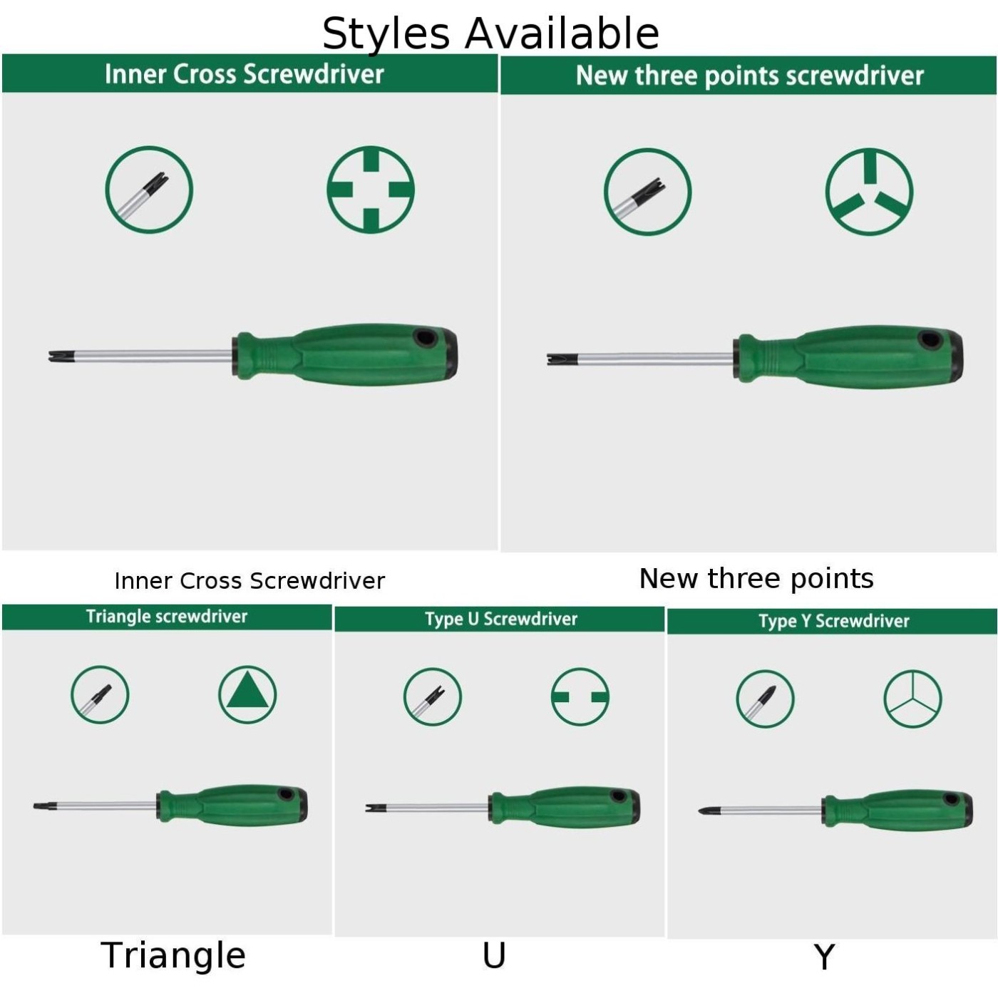 *There are 5 pieces magnetic screwdriver, U/Y/Inner Cross/Triangle/3 Points shaped, meeting all kinds of needs.