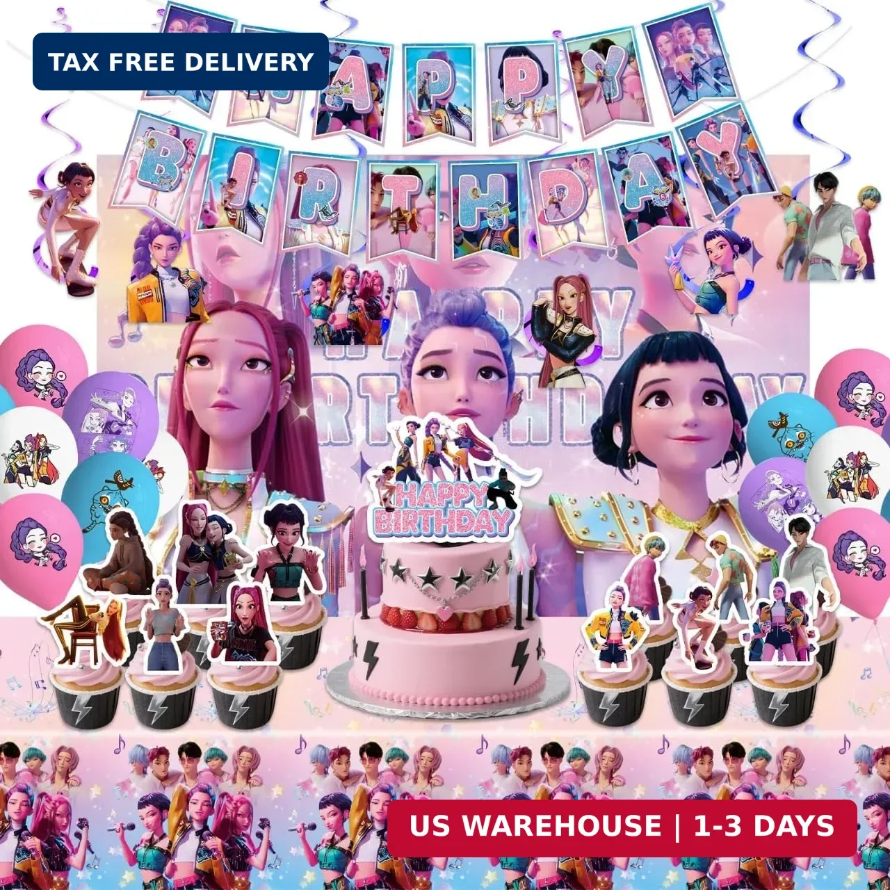 • 【Package Includes】 This Demon Hunters Birthday decorations kit includes 1pcs Happy Birthday Banner, 1pcs Backdrop, 1pcs Tablecloth, 1pcs Cake Topper, 6pcs Hanging Swirls, 24pcs Cupcake toppers, 16pcs Latex Balloons(4style). It has everything you need for a Kpop themed birthday party.