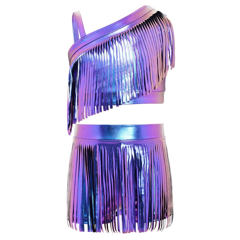 The metallic tassels on the crop top and shorts bring a sense of sparkle, making the girl stand out on the stage or at the party.