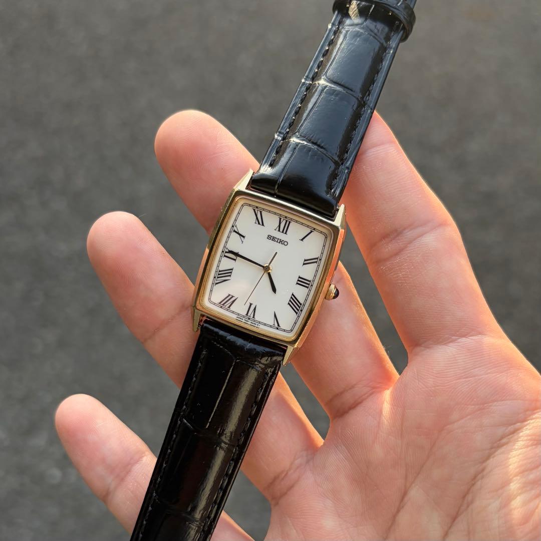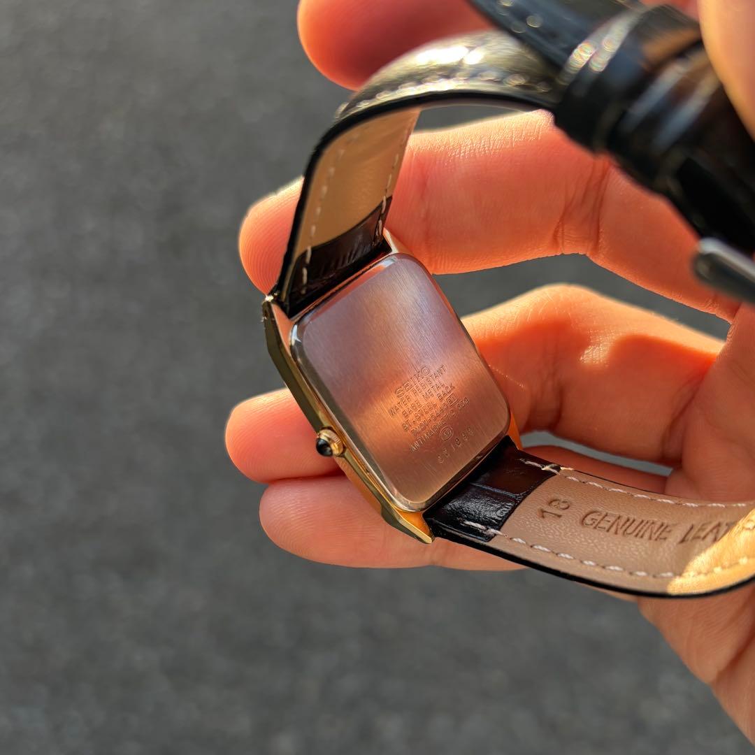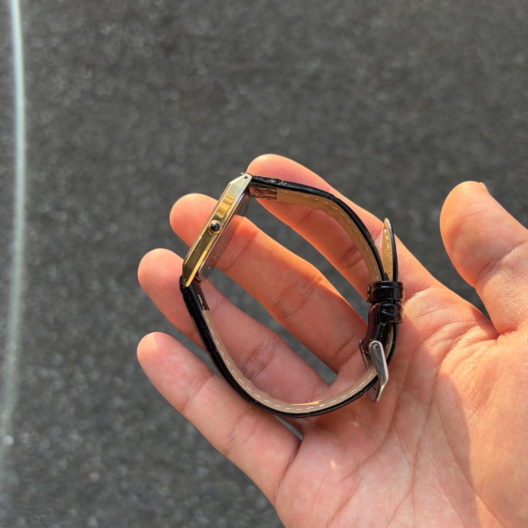 | Features | Roman numeral dial; quartz; new black leather strap |