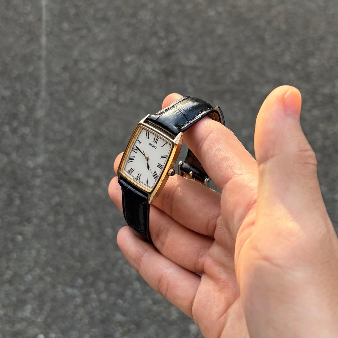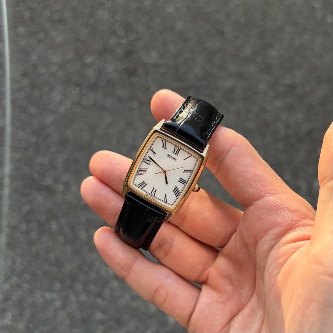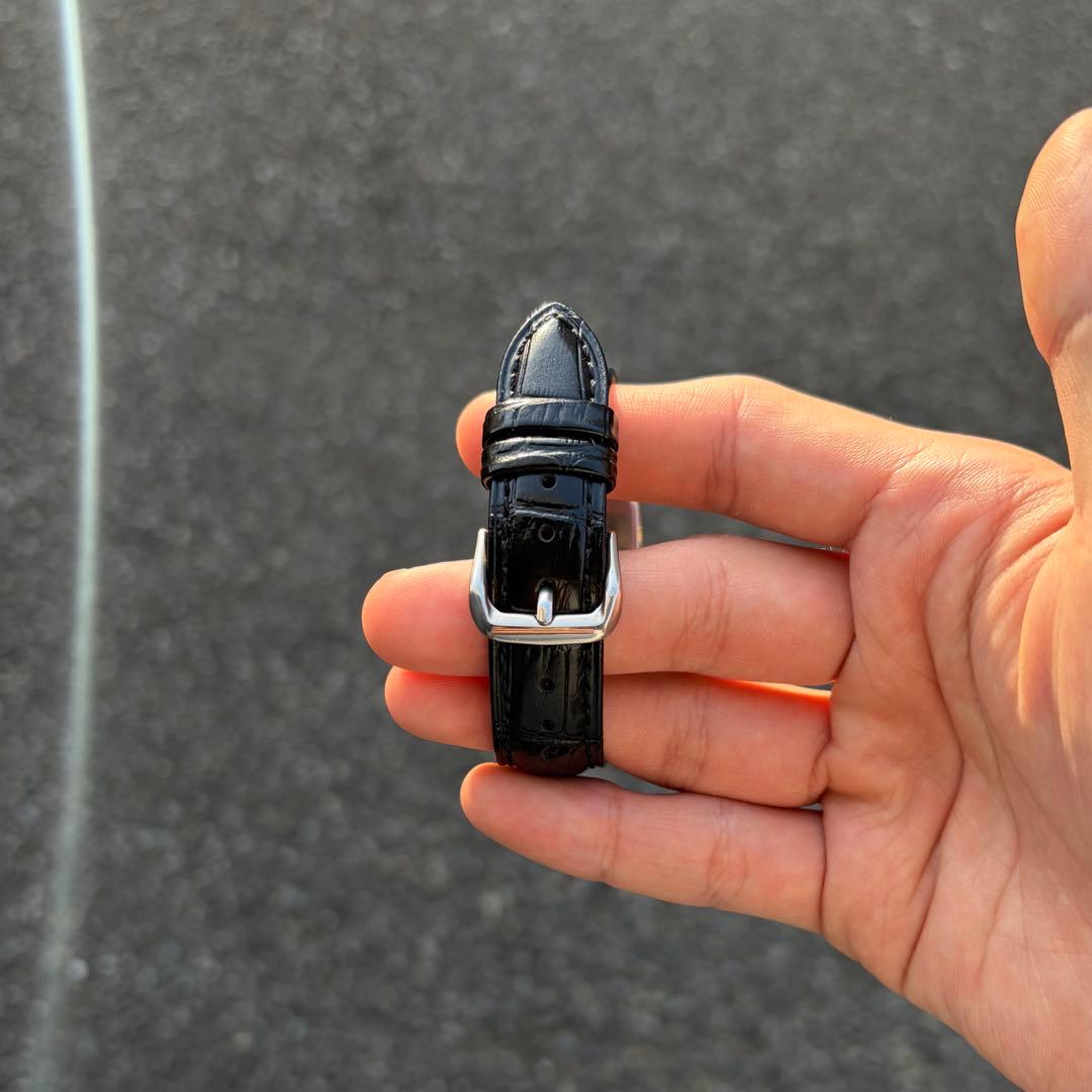 | Features | Roman numeral dial; quartz; new black leather strap |