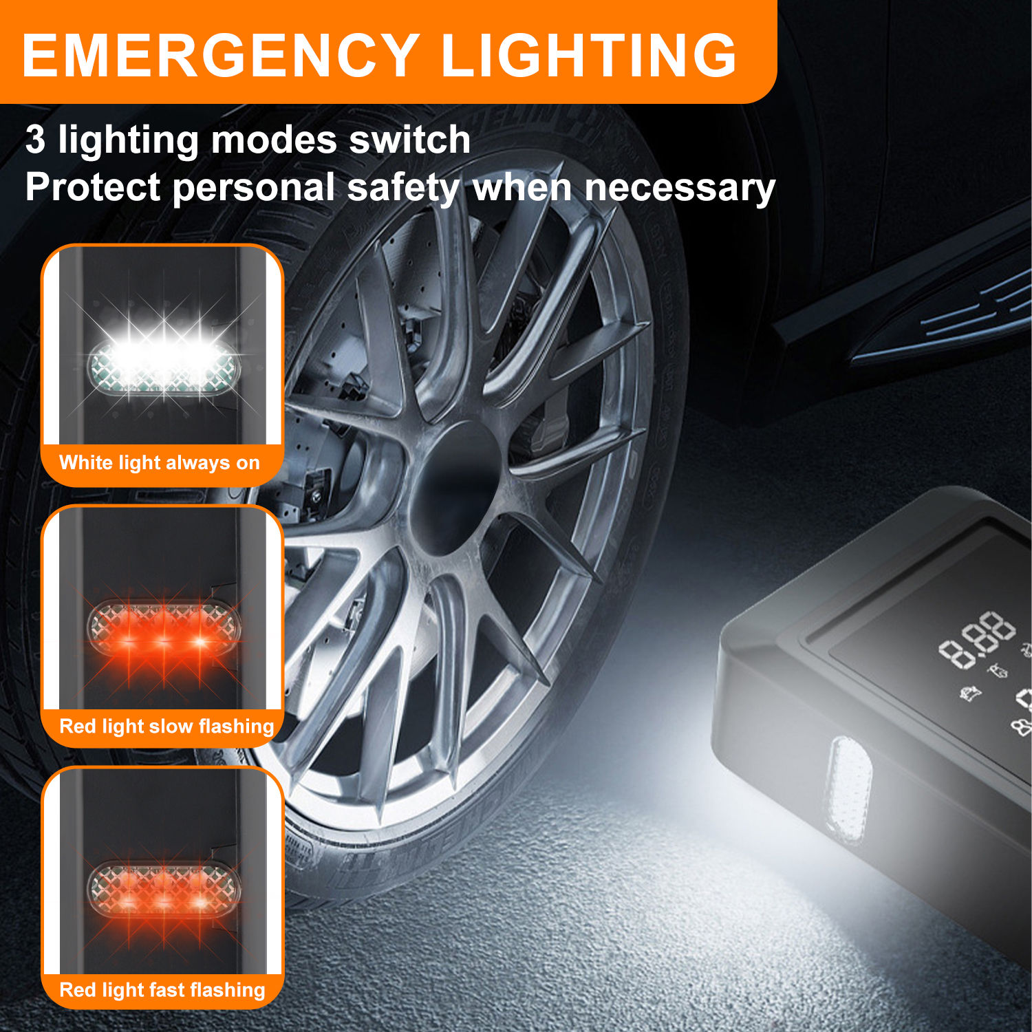 6. Emergency Lighting: Offers three lighting modes for emergency illumination, providing added safety and visibility during roadside emergencies.