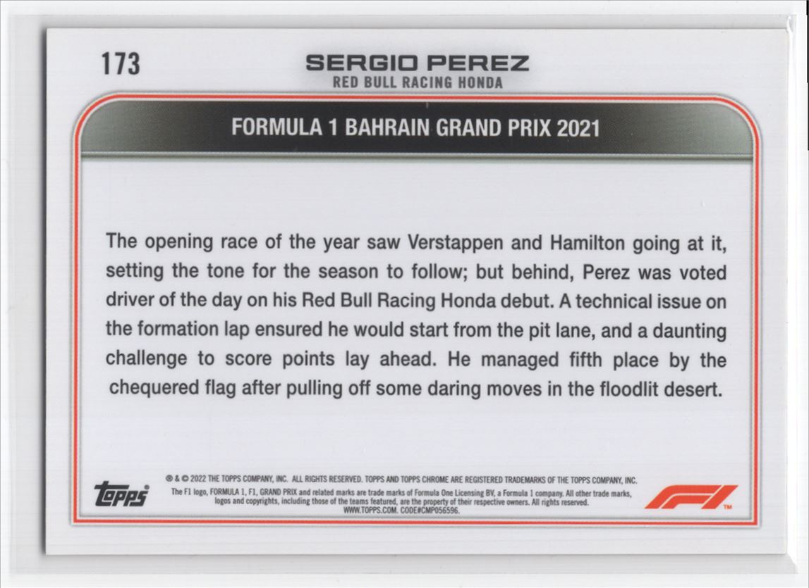 #173 2022 Topps Chrome F1 Sergio Perez Red Bull Racing Honda