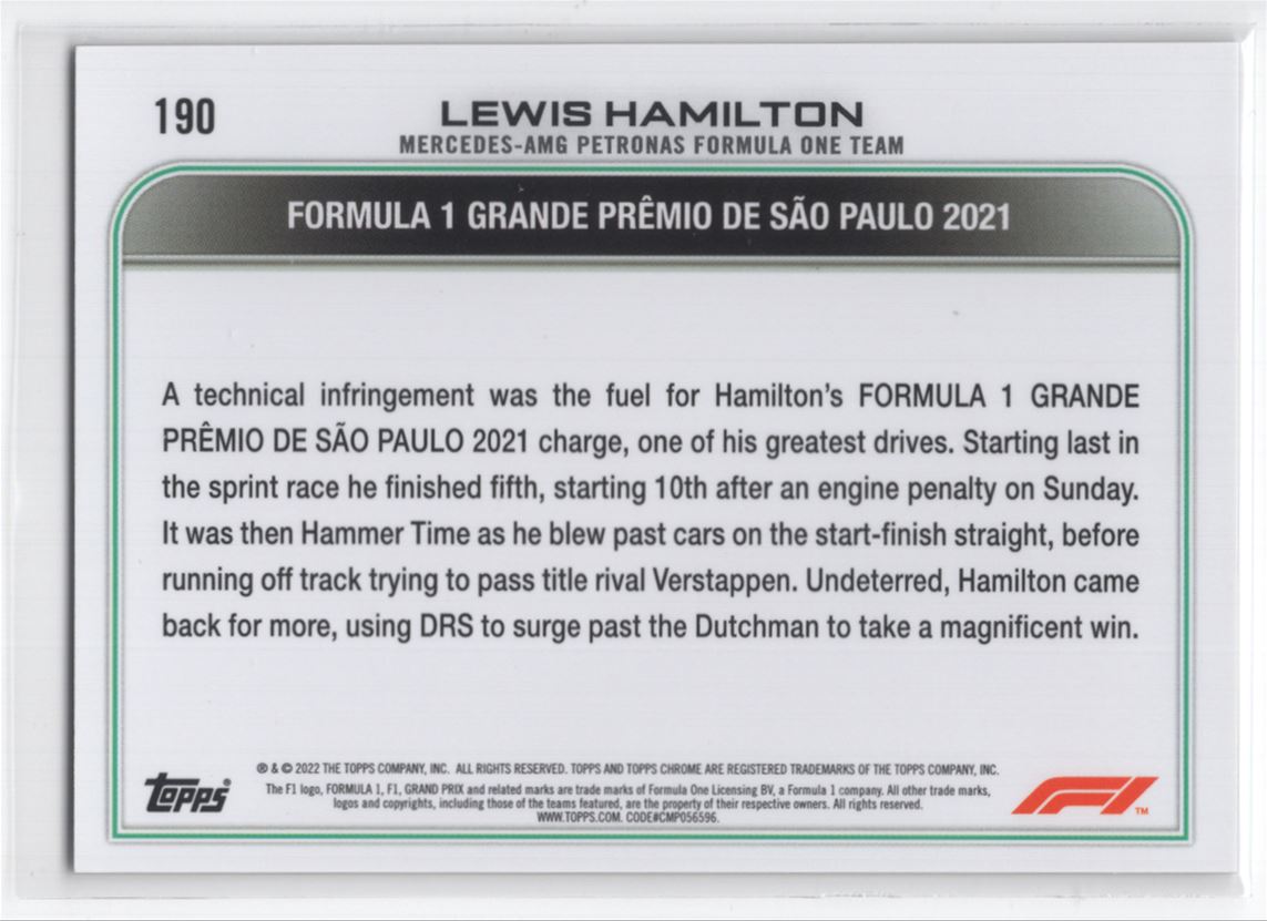 #190 2022 Topps Chrome F1 Lewis Hamilton Mercedes-AMG Petronas F1