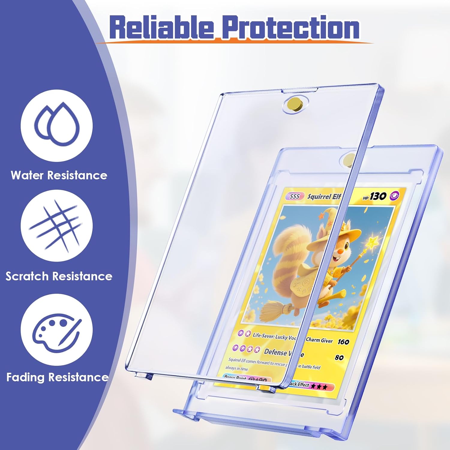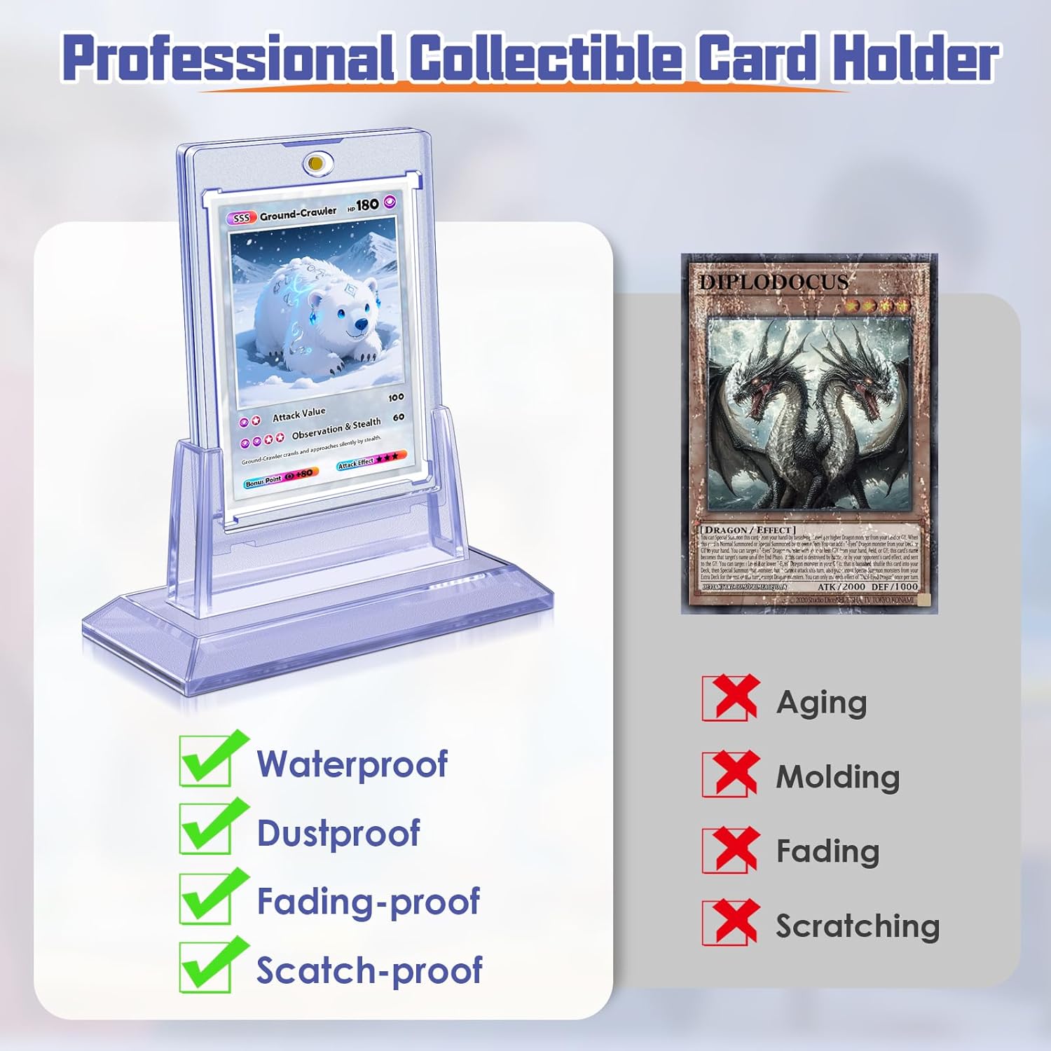 Upgraded Protection: The trading card holder offers reliable protection against scratching, aging, dust, moisture and other accidental damages. Recessed diamond-shaped corners give better care for protection and secure storage.