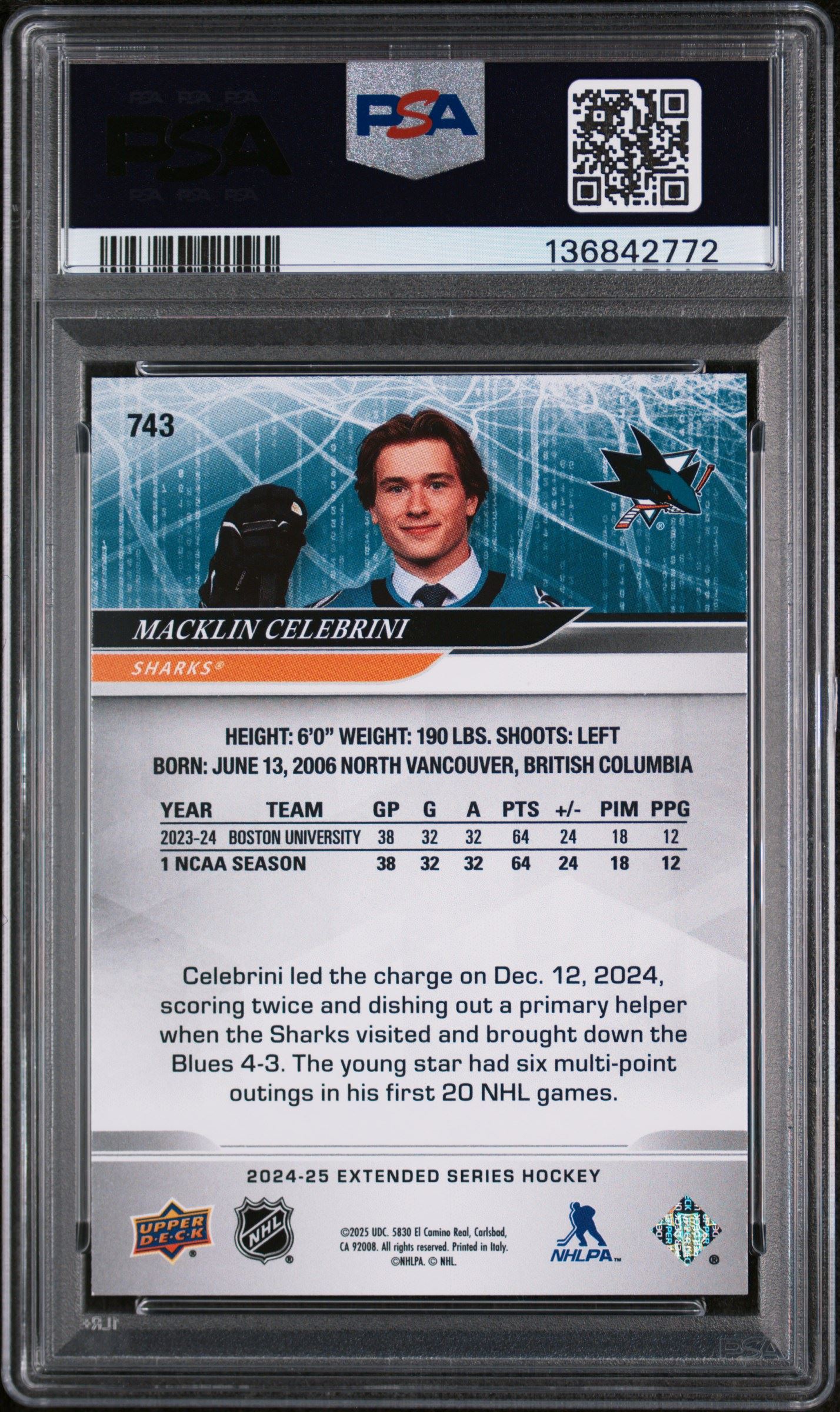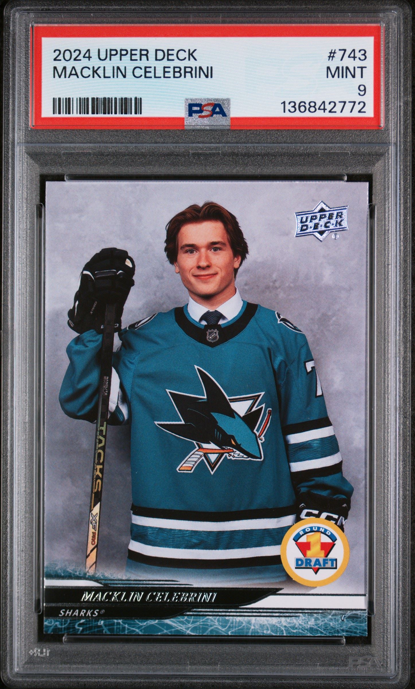 | 2024-25 UPPER DECK ROUND 1 DRAFT DAY MACKLIN CELEBRINI RC PSA 9 SAN JOSE SHARKS |
